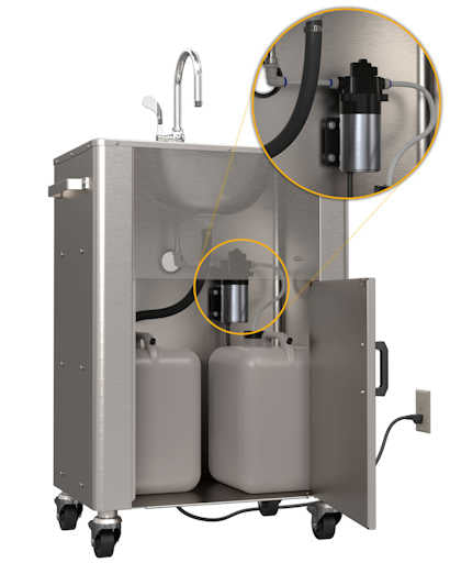• Operated by a 110-V, on-demand electric pump and comes standard with an onboard 5-gallon fresh water tank and a 6-gallon waste water tank.